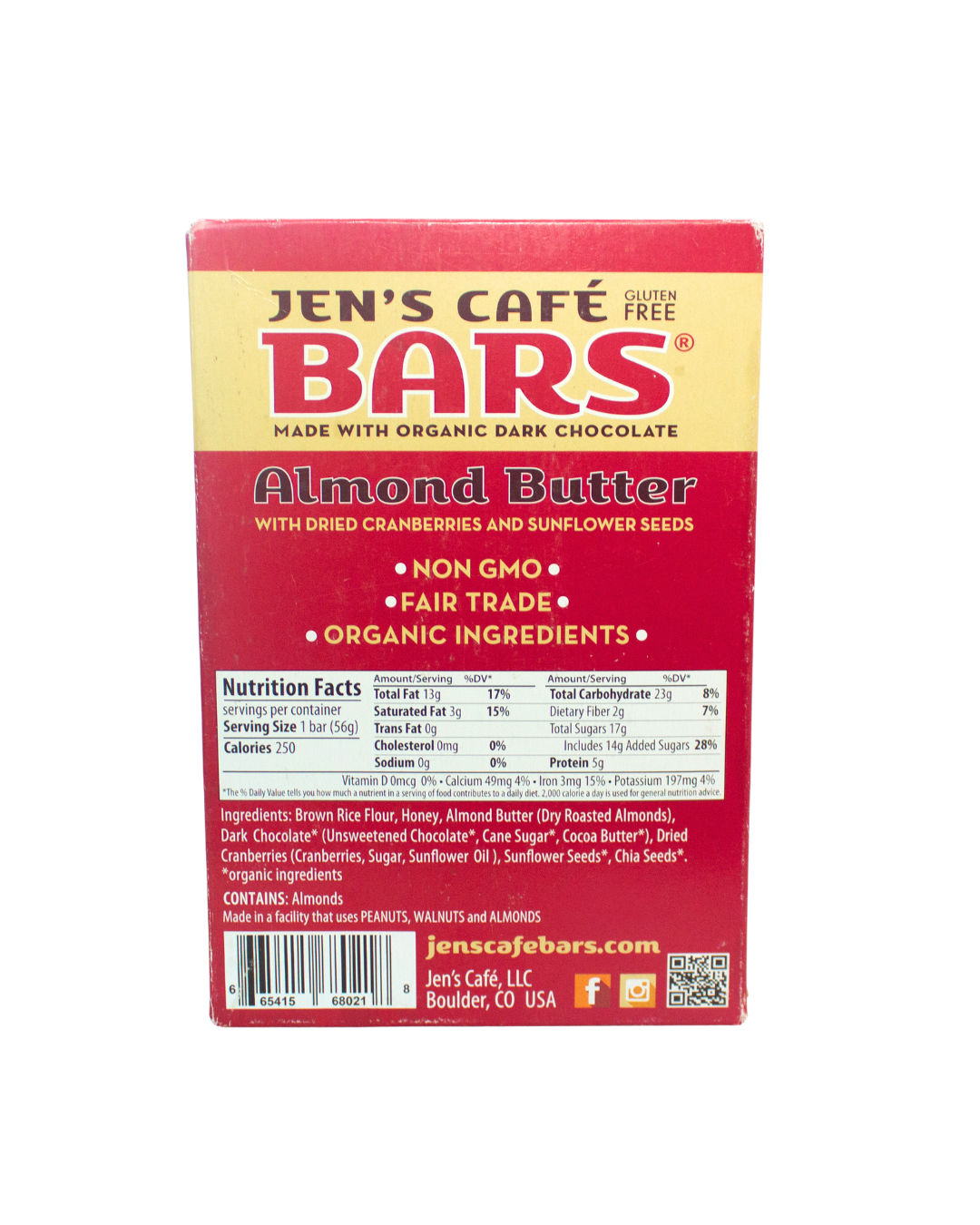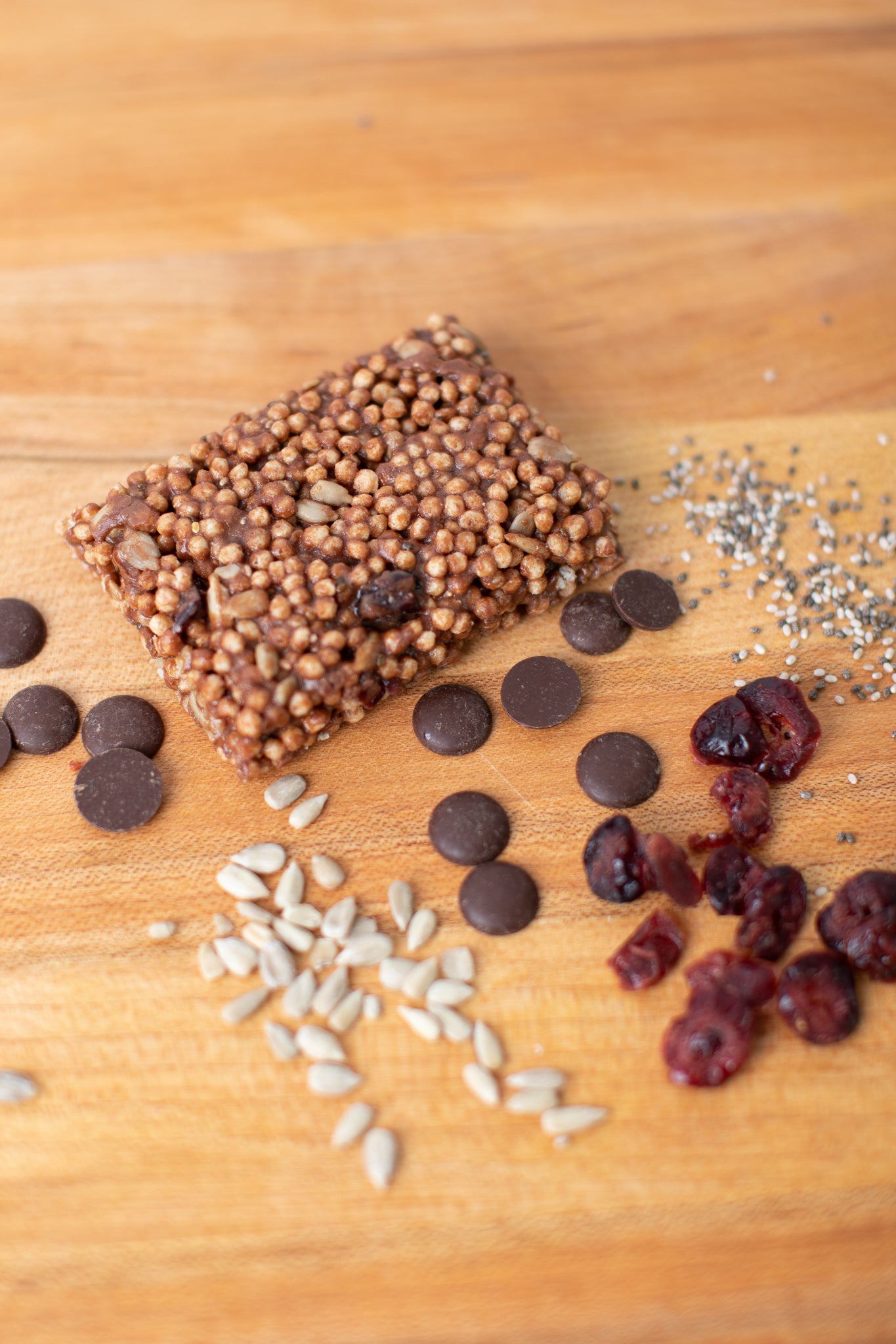 Ingredients: Brown Rice Flour, Honey, Almond Butter (Dry Roasted Almonds), Dark Chocolate* (Unsweetened Chocolate*, Cane Sugar*, Cocoa Butter*), Dried Cranberries (Cranberries, Sugar, Sunflower Oil), Sunflower Seeds*, Chia Seeds*.
