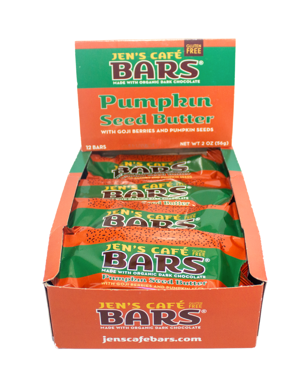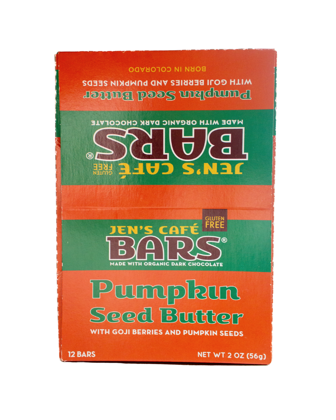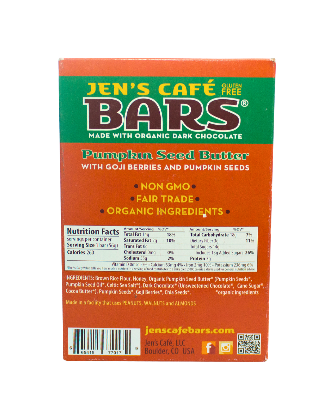 Ingredients: Brown Rice Flour, Honey, Pumpkin Seed Butter* (Pumpkin Seeds*, Pumpkin Seed Oil*, Celtic Sea Salt*), Dark Chocolate* (Unsweetened Chocolate*, Cane Sugar*, Cocoa Butter*), Pumpkin Seeds, Goji Berries*, Chia Seeds*.